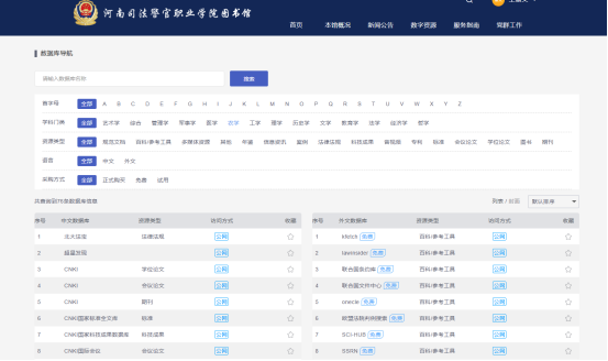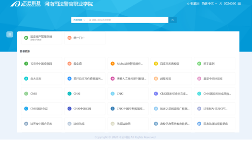 引进各类资源数据库17项,包括:CNKI中国知网数据库、超星移动图书馆、中国共产党思想理论资源数据库、民族音乐数据库、图书馆发现系统、法信、外语多媒体学习库、笔杆论文写作查重服务平台、软件通、喻白在心理、杰程专升本数据库、优秀传统文化视频库、超星数字歌德借阅机、北大法宝数据库、银符考试系统数据库、习近平新时代中国特色社会主义思想知识服务平台数据库等。