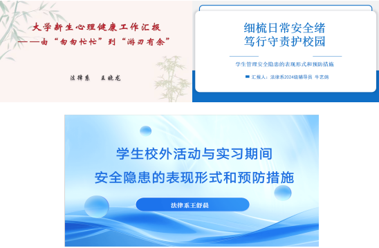 交流会上,法律系2025级辅导员王晓龙、2024级辅导员牛艺鸽、2023级辅导员王舒晨,分别以《大学新生心理健康工作汇报——由“匆匆忙忙”到“游刃有余”》《细梳日常安全情绪,笃行守责护校园》《学生校外活动与实习期间安全隐患的表现形式和预防措施》为主题依次发言。随后,各系与会辅导员进行了深入交流。