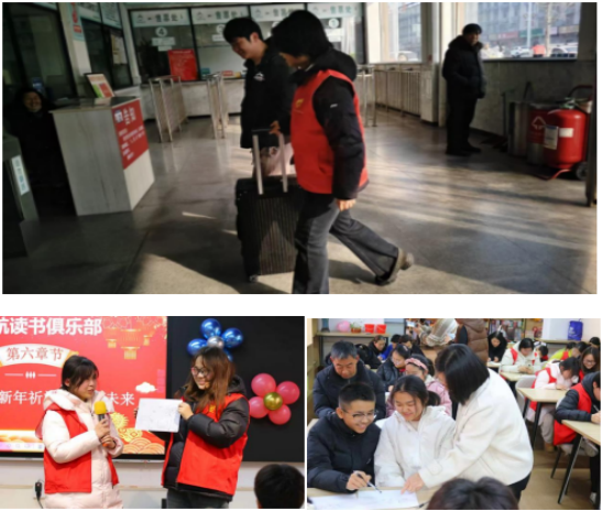 信息技术系学子分赴多地护航,在平舆县汽车站参与“青春志愿行,温暖回家路”活动,在候车厅、售票区维持秩序、搬运行李,张贴福字营造节日氛围;在开封火车站为老年旅客讲解自助购票流程,细致提醒发车时间、站台信息,以“眼勤、嘴勤、手勤”的坚守,守护旅客安心返乡。